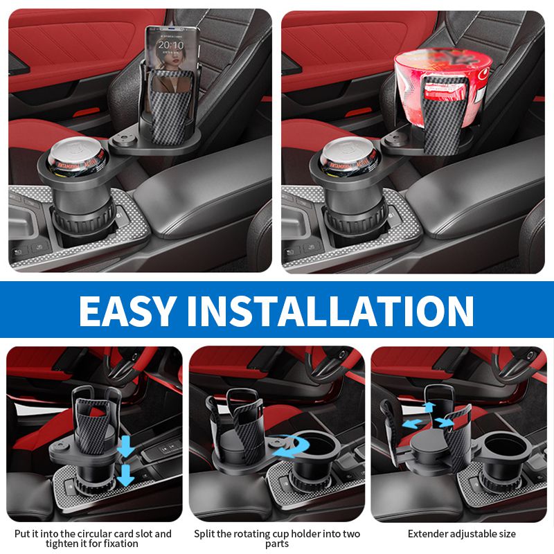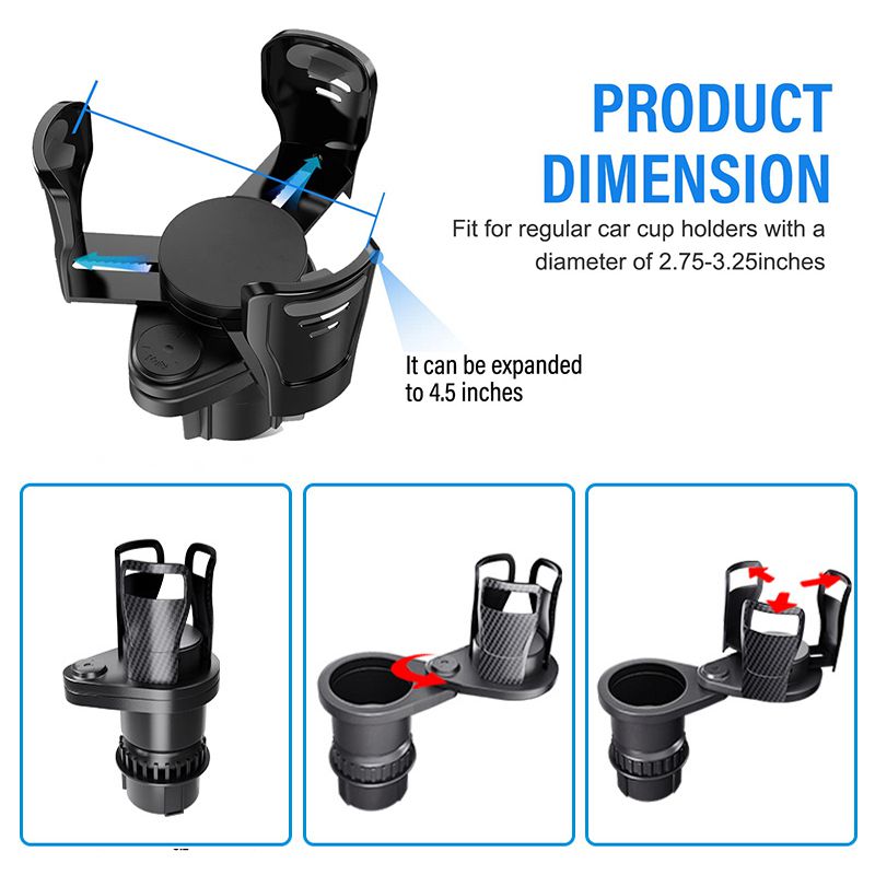 2-IN-1 CAR CUP HOLDER WITH 360° ROTATABLE BASE The base of the upper cup holder canrotate 360 degrees freely, One Car cup holder can bechanged into two for use.