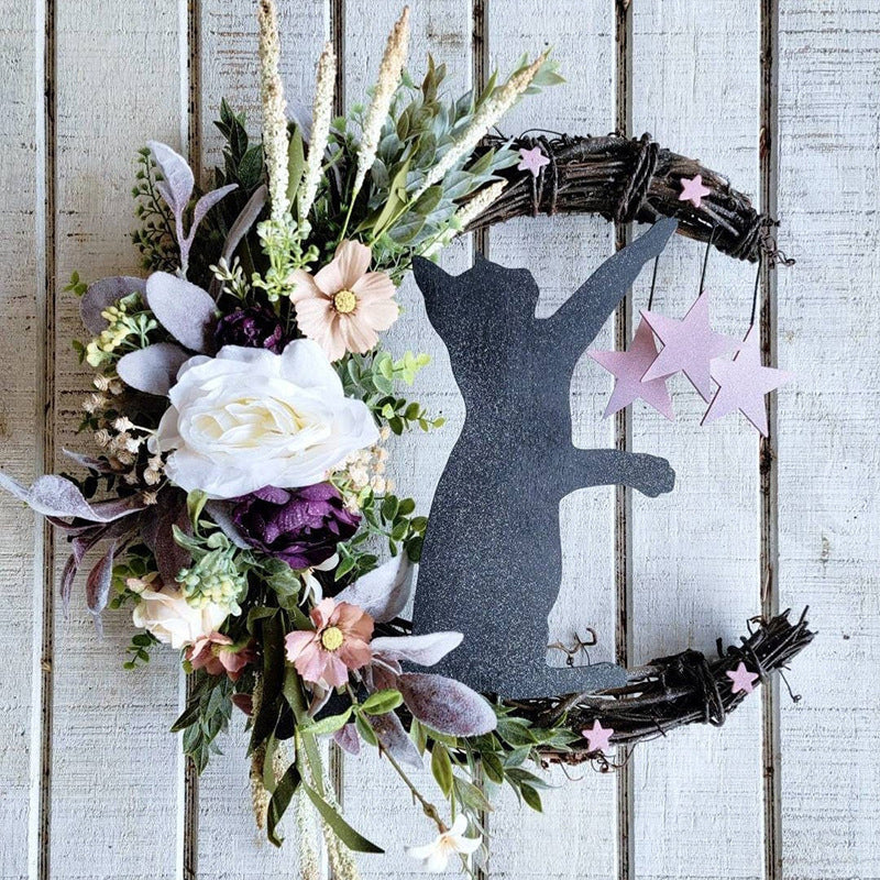 [Witchy Celestial Door]: Cat Wreath Plant Crescent, Purple Flowers and Stars, Witchy Celestial Door Hanger, Halloween Moon Home Decor, Gifts for Cat Lovers. Suitable for Halloween and Christmas, all kinds of holiday decorations.