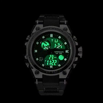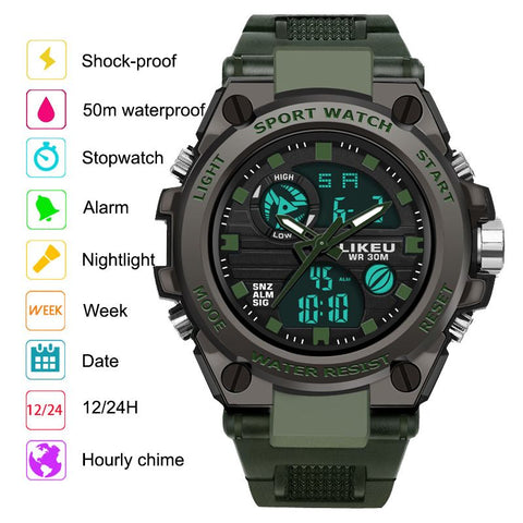 Multi-function: Dual-time display, date, week, 12/24H, hourly chime, alarm, Nightlight, stopwatch, 50m waterproof, shock-proof.