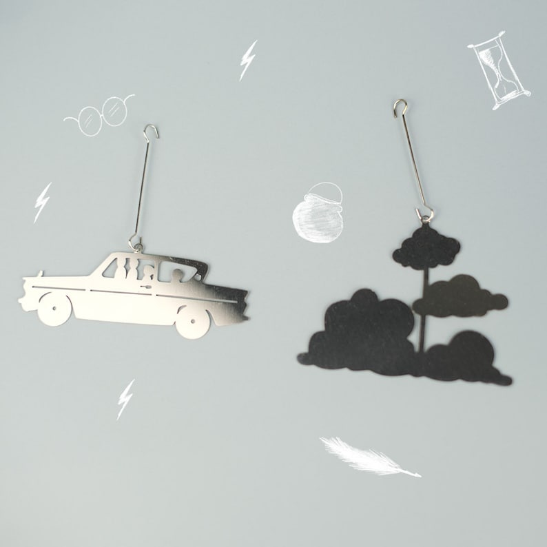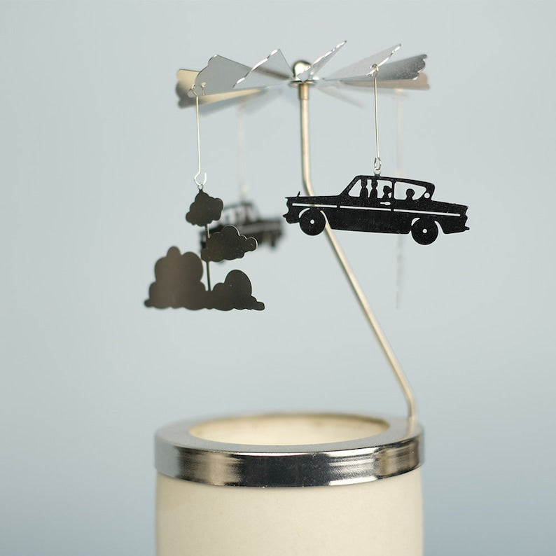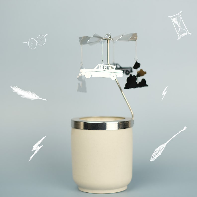 - Embellish your favorite candles with this beautiful moving ornament carousel. Depicting the iconic scene with our favorite flying car! - "Like magic" the candle carousel moves and rotates when the warm air rises due to the candle.