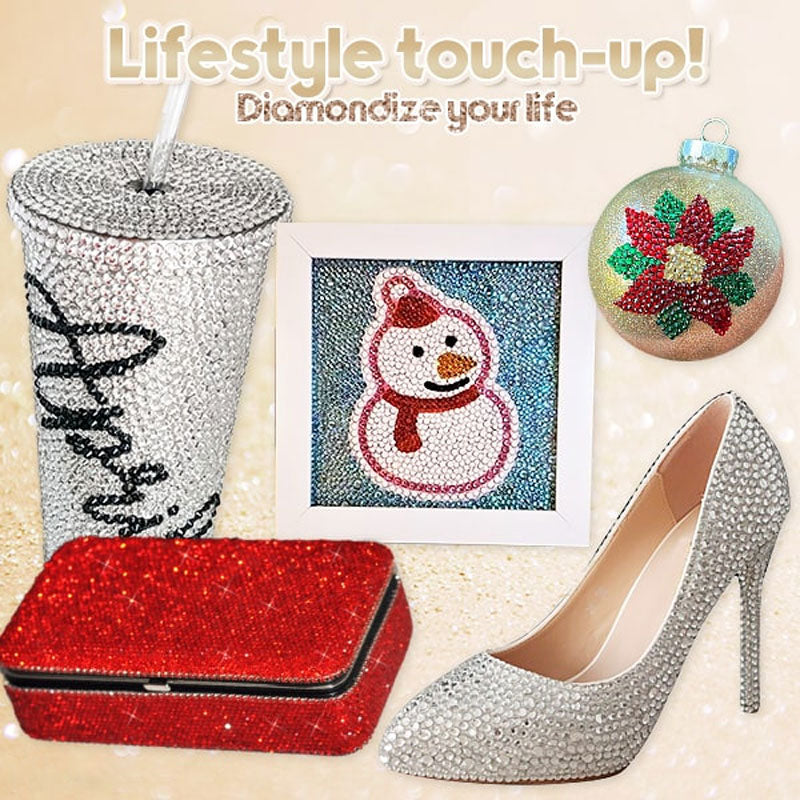bags, shoes, phone case, wallets, phone holders, watches, hair pins, headbands, notebooks, glassware, ornaments, and even for nails. Simply fill it up first with diamonds, rhinestone or crystal, align it to your canvas or item that you want to decorate and just press the metal button to push and set the diamond and done.