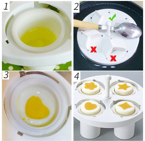 Assemble a non-stick silicone box, boil it with hot water before use, dry it, then add or spray cooking oil (using the silicone brush we provide), pour the egg white and egg yolk in order Pod, then close the top, boil for 10-15 minutes, pop it and enjoy.