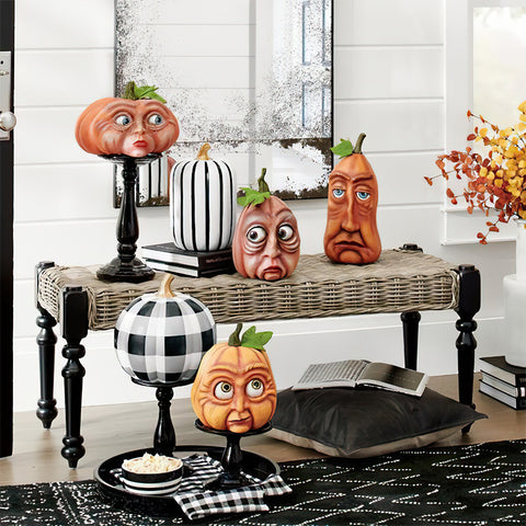 Not the happiest pumpkin in the patch, but Edgar brings real personality (and probably a few grins) to your whimsical Halloween arrangement. Long-lasting paper–mâché construction, this Expressive Pumpkin is shaped and hand-painted to bring unique character to life. Dimensional embellishments, like his fabric leaf and curlicue topper, are worthy of a second (or third) look. He looks especially handsome with displayed with other Expressive Pumpkins in our collection.