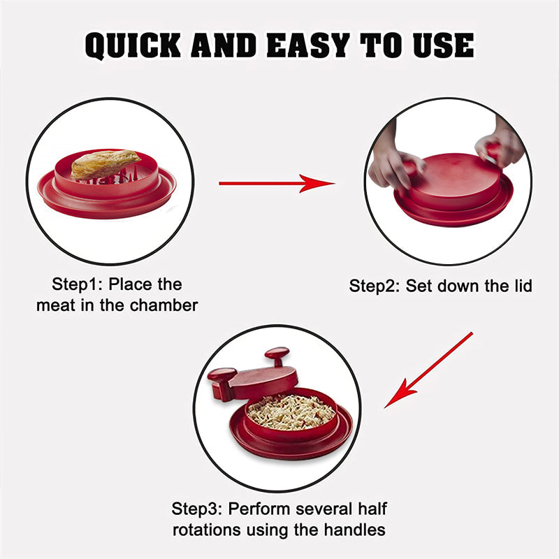 • 🥰HOW TO USE - this handy meat chopper is a lightweight and versatile kitchen tool that makes tearing through foods a cinch. All you have to do is put the meat inside the chamber, set down the lid, and perform several half rotations using the integrated handles