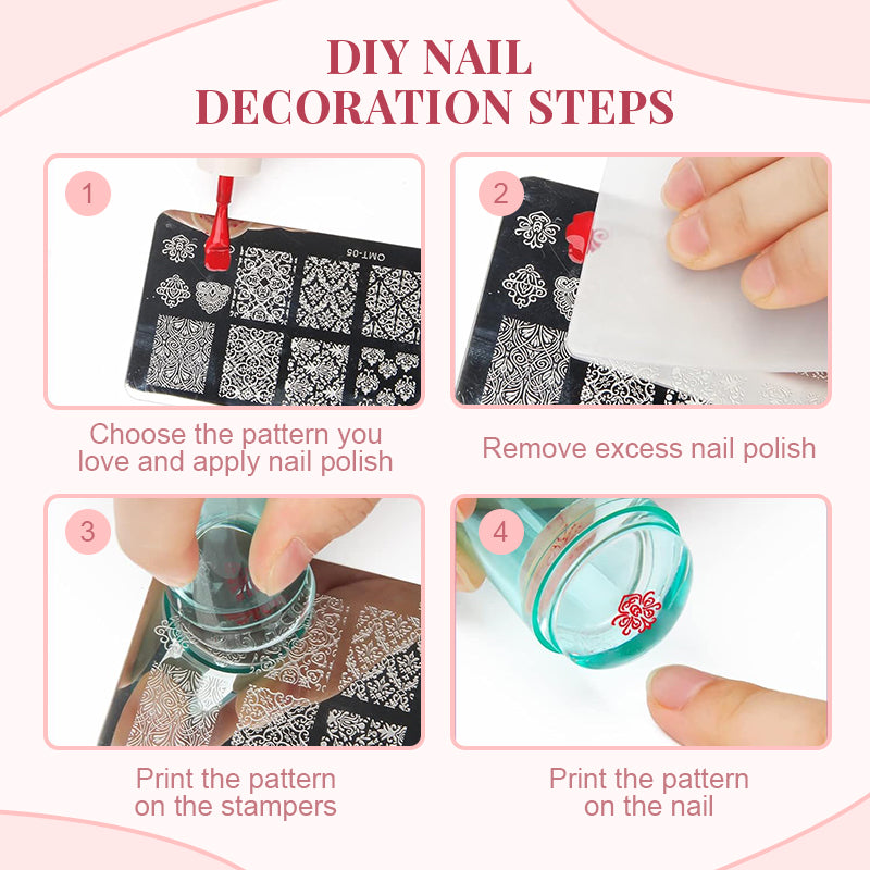 DIY nail art embossing plates with multiple designs and endless shapes.