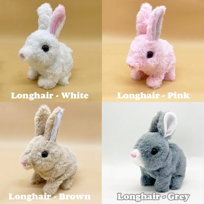 Rabbit with tails walk forward while making sounds. The elastic rabbit toys feature very soft plush.