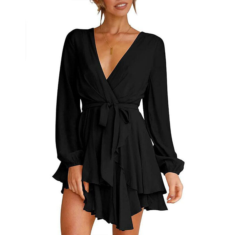 Women's Dress Deep V-Neck Long Sleeve Waist Tie Ruffle Mini Swing Skater Dresses