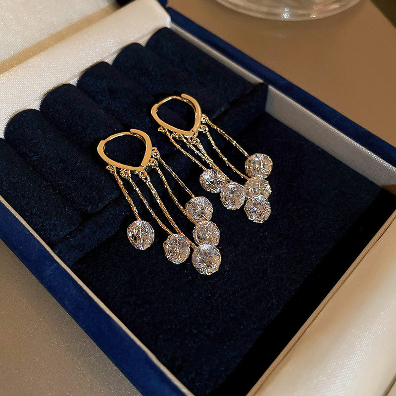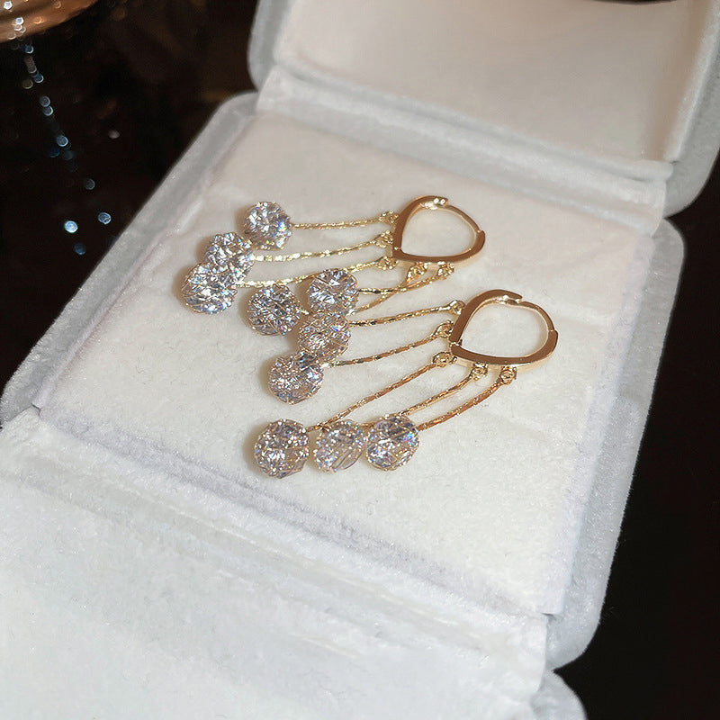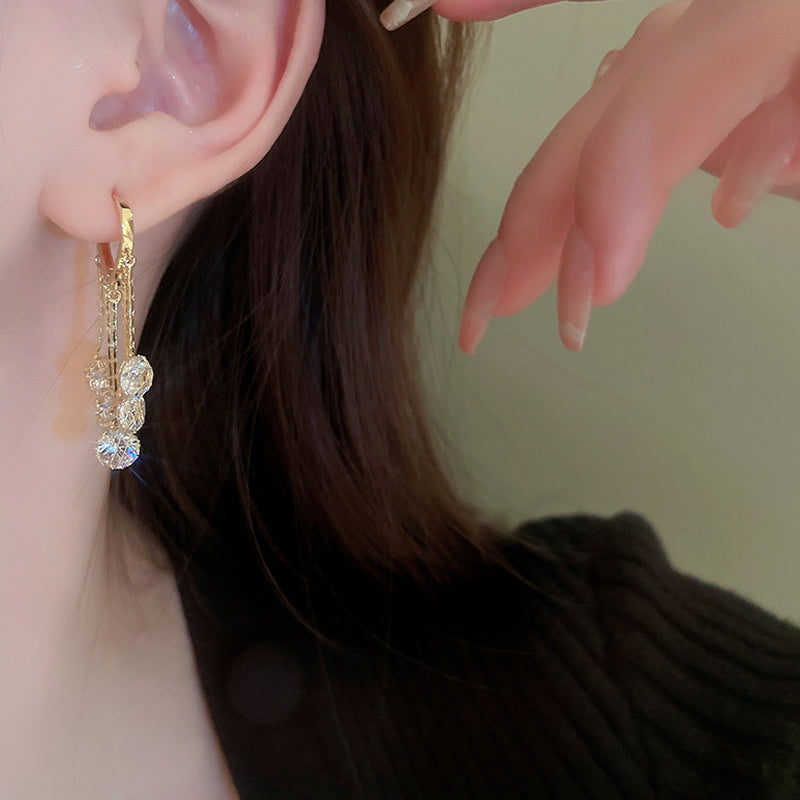 Gold plated diamond chain tassel earrings. The perfect combination of Korean fashion and high-end design, these delicate earrings are the ideal accessory for any fashionista looking to add a touch of sophistication to their wardrobe.