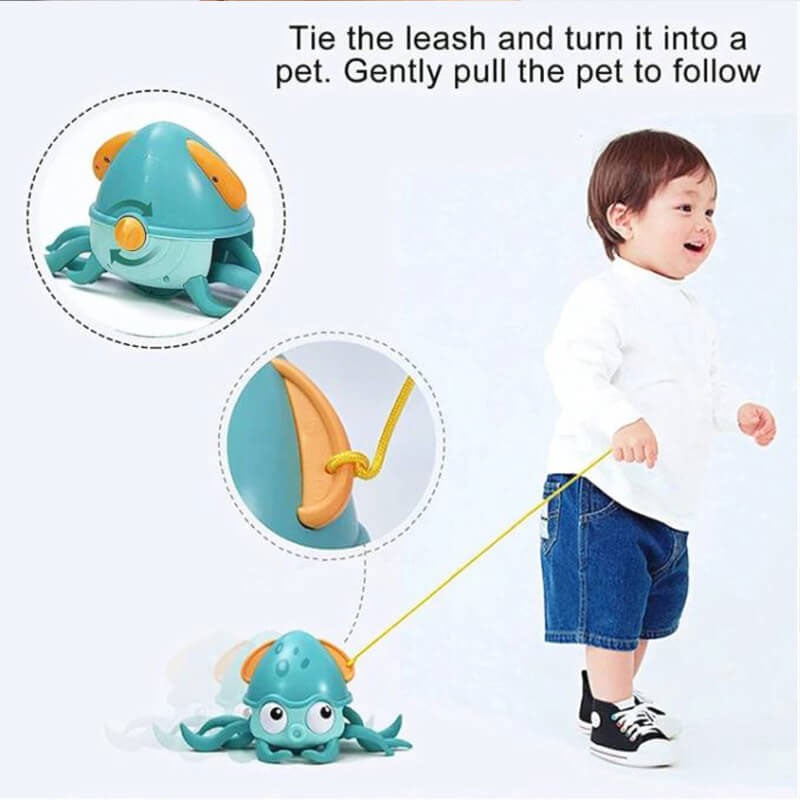 Clockwork driven! Twist the grip behind the octopus tummy clockwise and the cute octopus will swim quickly in water around your kids or crawl all over the house!