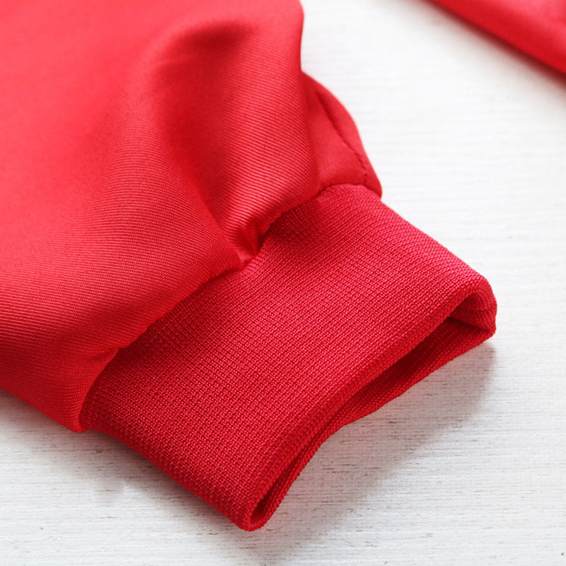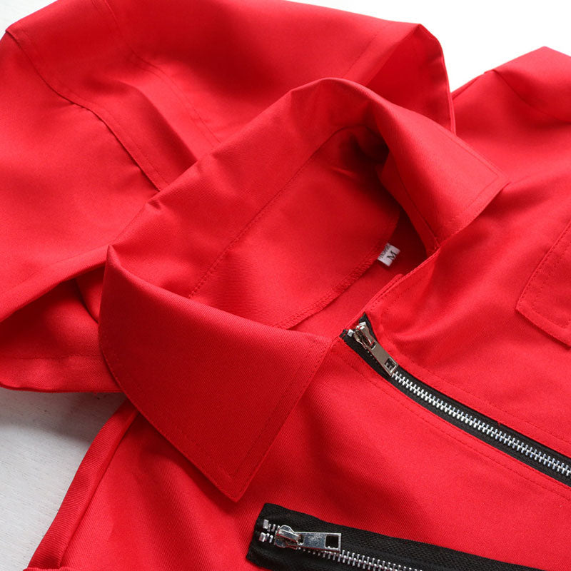 • Vibrant Red Jumpsuit Features Functional Zippers and a Hood