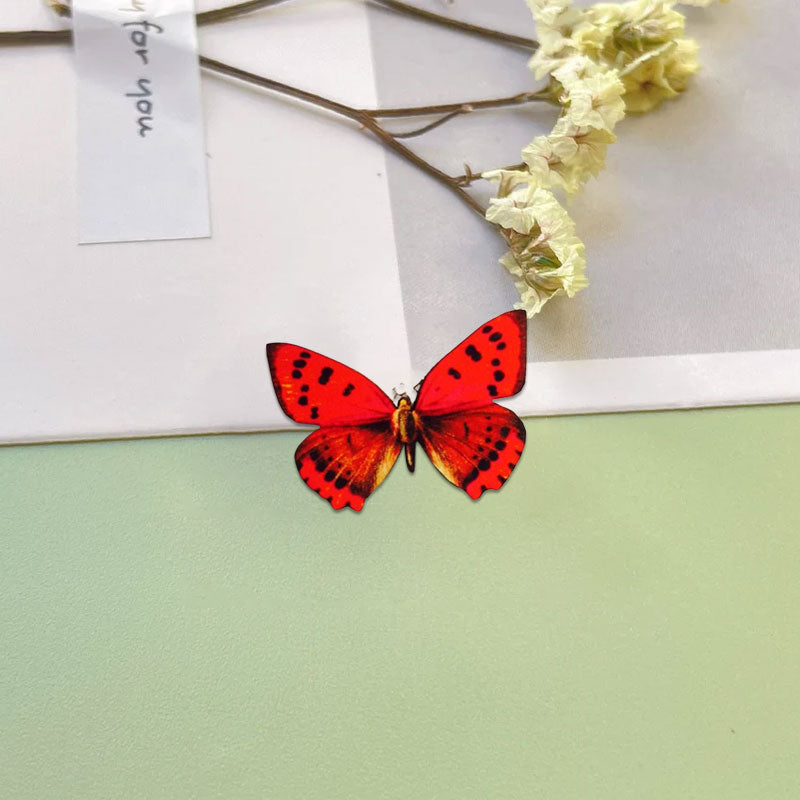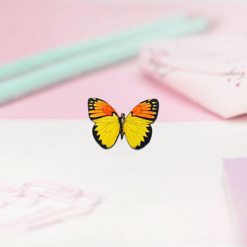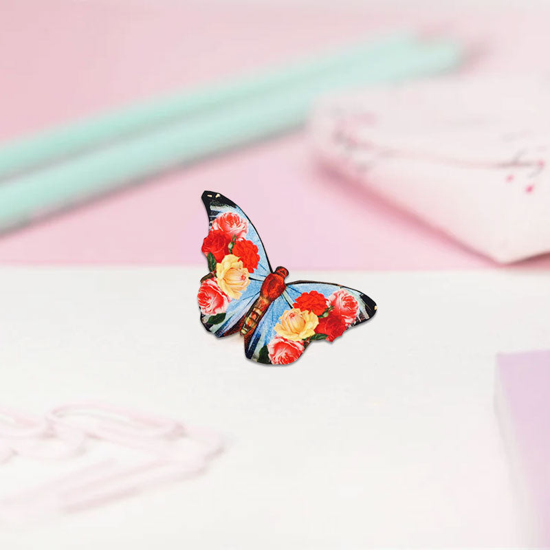 These pretty muted yellow and blue butterflies with red and yellow roses on their wings and brooch pins will brighten up any outfit. Made of wood and paper, it is laser cut and turned into a brooch.