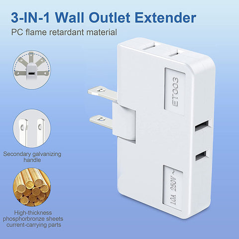 ⚡【Multi-Function Swivel Plug Extender】 Easily convert one indoor ungrounded flat plug adapter into three with this 3 way rotatable socket converter.⚡【Space Saving and Easy Access】 Compact adjustable 2 prong outlet extender design allows you to use large adapter-shaped plugs, 180-degree rotating type A flat wall plug can be bent into different angleswithout obstructing other outlets and keeps all plugs close to the wall to avoid clutter. Perfect to wall tap outlet behind couch or behind bed.⚡【Safety Guaranteed--Fireproof and Durable】 This flat outlet adapter which is made of PC flame retardant materialis a perfect addition to any indoor AC plug adapter. The portable size can also be used as a sideways electrical outlet for travel in the United States or Taiwan. They can be used for personal use or as a giftto family and friends.⚡【Rating】 This 3 outlet wall adapter is rated for a maximum of 125VAC, 15A, 2500W; the ungrounded 2 prong adjustable wall tap outlets allow you to safely plug 3 125v AC devices into a single outlet.