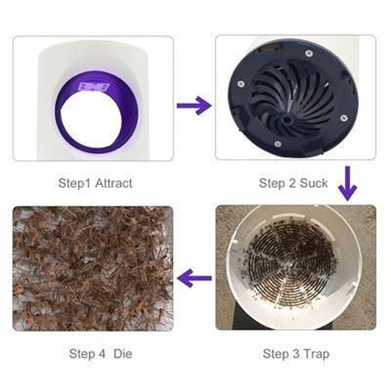 SILENT VACUUM – Once the mosquitos get within range of the trap, a strong vacuum fan will suck the mosquitos into an Anti-Escape Trap.