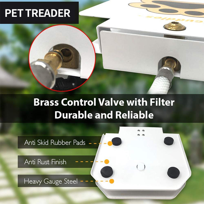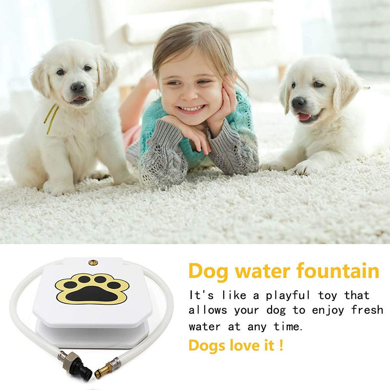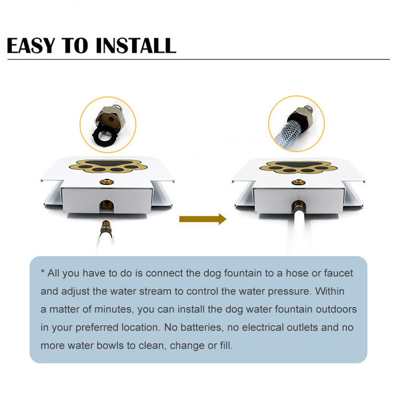 • 🐶🐶EASY SET UP: Setting up this doggie water fountain outside requires absolutely no specialized skill. Every purchase comes with bonus adaptors, connectors, and a 2-way Y hose connector that let you easily connect this pet water fountain to your water connection! Adjusting water pressure is done easily using the control valve on the yellow splitter.