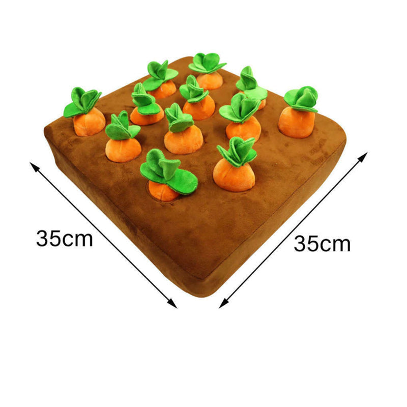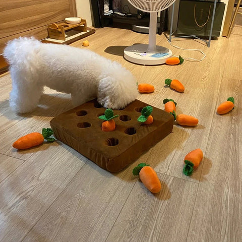 Dog Training Toys This dog feed mat include 1 radish field and 12 carrots.?you can hide food in the hole while you take away the carrots. Then restore the carrot. According to your pet's natural abilities to change the difficult level. Help your dog eat slowly and increase the eating time, consume your dog's energy and lose weight. Keep your dog occupied and avoid your baby being bored and engaged in destructive behavior.