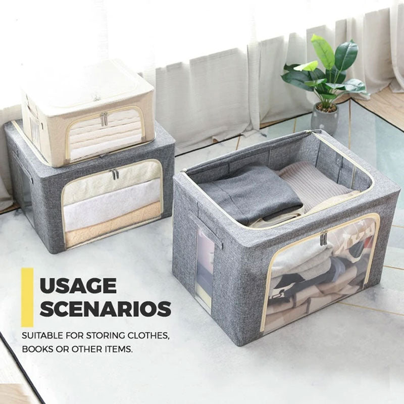 The polyester and linen material is waterproof, dustproof, moisture-proof, and mildew-proof, and the internal thickened steel frame is durable and not deformed. Can store more than 60kg, can be stacked, durable.