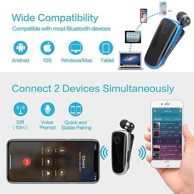 Comfortable & Convenient Retractable Bluetooth Headset with Clip-on design, you can clip on the collar, tie, or shoulders. Also, when you no need the earbuds, just retracted the earbud. Release the pressure on the ear. Real comfortable Bluetooth headset for your right or Real comfortable Bluetooth headset for your right or left nearside.