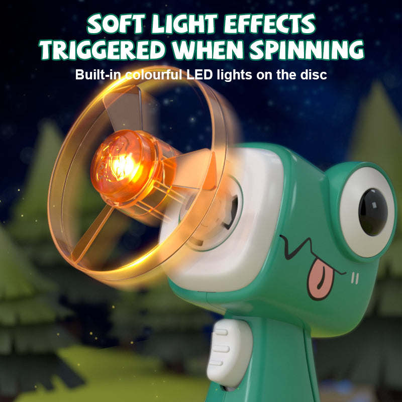 【Cute Disc and Gyroscope 2-in-1 Launcher】This multifunctional flying disc launcher toy includes 1 cute dinosaur launcher, 4 flying saucers, 1 light-up flying saucer and 1 light-up spinning top. Let your children experience multiple fun at once.