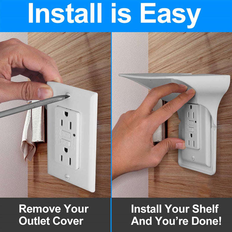 đ„ăInstall in minutesă: The socket shelf's easy to use installation allows you to finish installing it over the wall outlet in a couple of minutes, the socket shelf requires no additional hardware, simply remove the existing outlet cover, attach the socket shelf hanger then replace cover, no mess, no hassle, wall plug outlet shelf with a standard screwdriver.