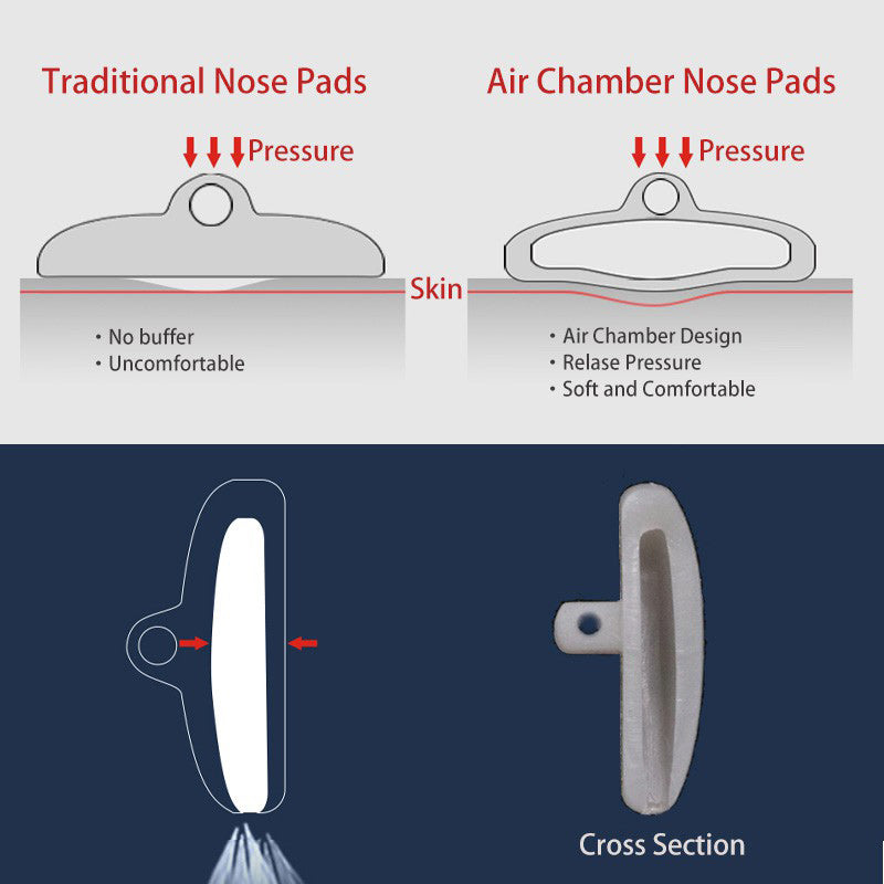 【Air Bag Decompression Design】: In order to reduce the burden on the bridge of the nose, a hollow design is used in the middle to effectively buffer the pressure of the glasses on the bridge of the nose. There is a small hole at the bottom of each nose pads to facilitate pressure discharge. These scientific designs effectively ensure that the bridge of the nose will not be compressed, and there will be no Ugly marks.