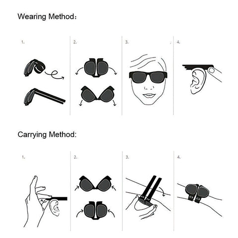 This sunglasses roll up very small and fit in your purse or even your pocket. Just fold the frame and slap it around your wrist, steering wheel, bag strap or bike handlebars.