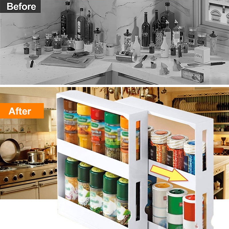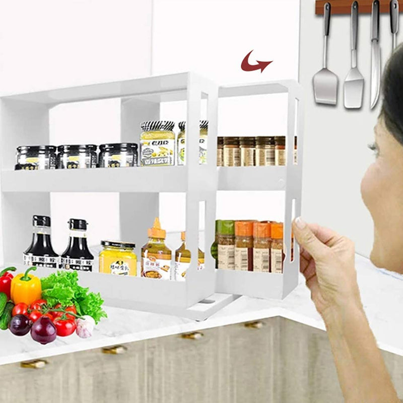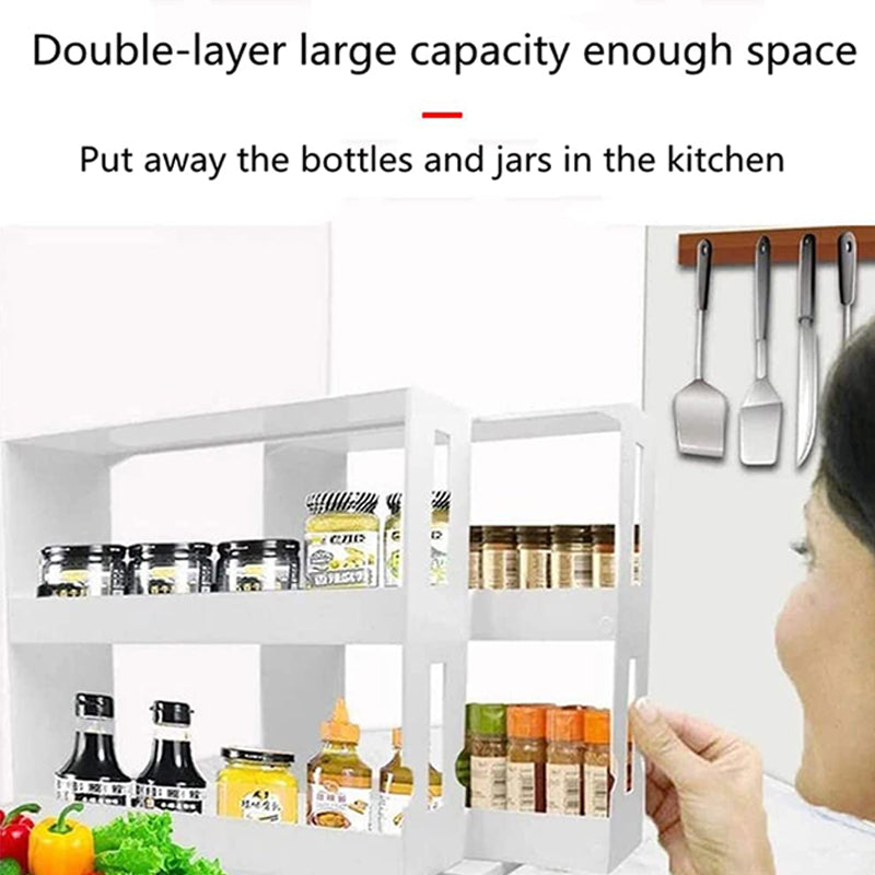 Our 2-Tier Spice Rack creates tons of storage space in your kitchen and makes the most of your cabinets! Each layer can be pulled out, so even the spices in the back are still accessible. The separate drawer not only pulls out but also rotates for quick and easy access, a great spice rack organizer and a real space saver!