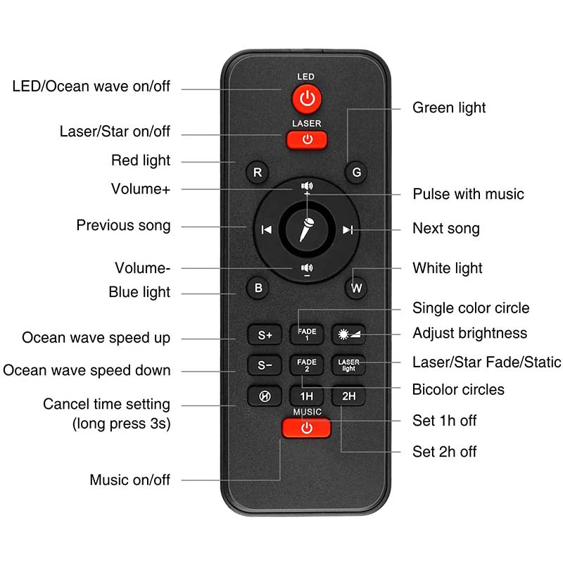You can easily change the mode via the remote control to customize your needs. Select ocean wave or star projection mode or both, change wave light color/speed/brightness, adjust music mode/volume/sound activation mode, set 1h/2h timer or 4h auto-off timer.