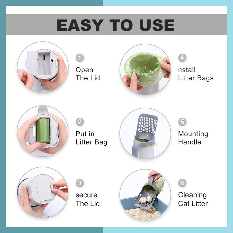 🐾 Convenient Design: Our trash scoop is a clever combination of trash bag and holder. No more tedious steps, allowing you to quickly and easily clean your litter box with just one hand. When you're done, just remove the spoon from the bin, tie the bag, and throw it away.