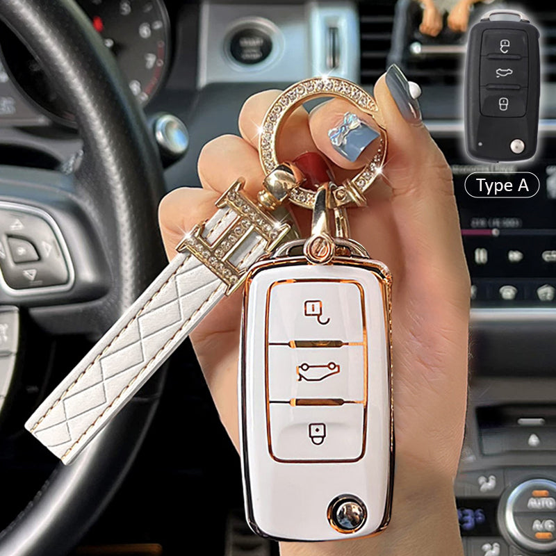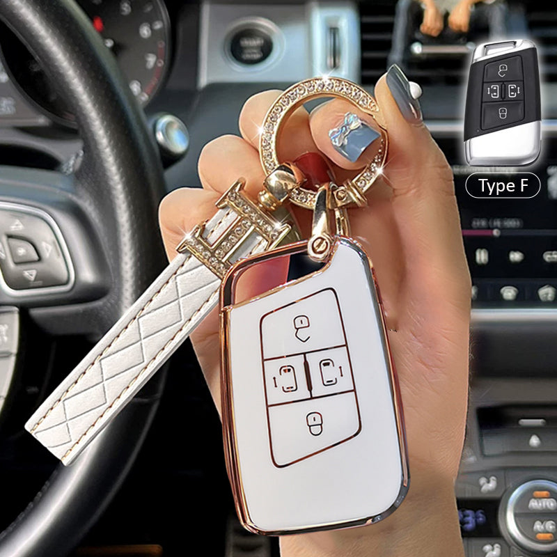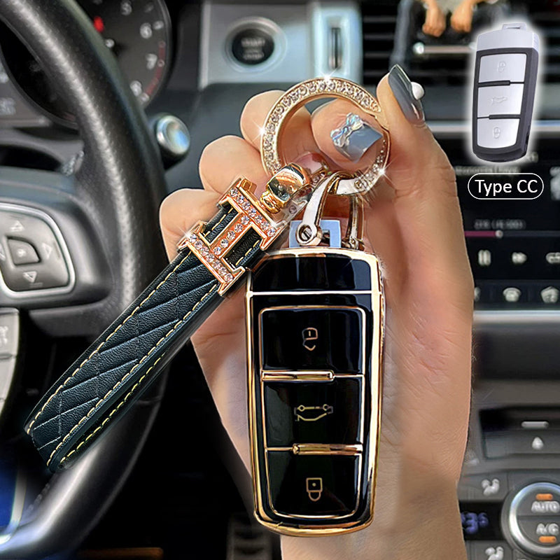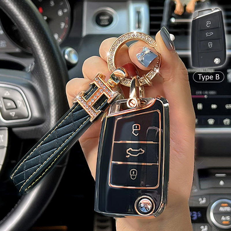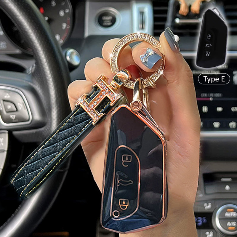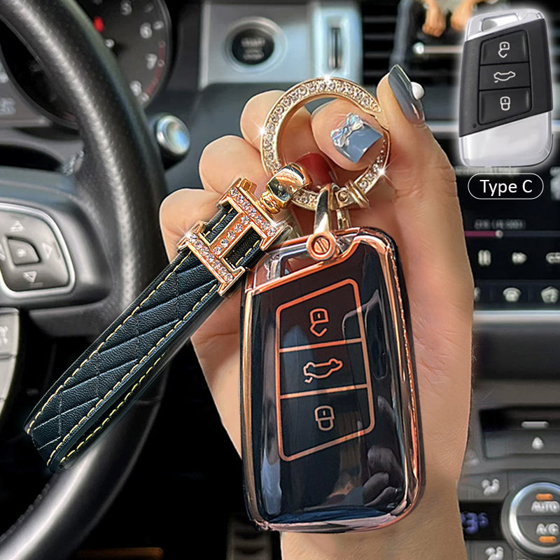 The back of this key cover is stitched with leather and it will not be scratched when you place your key on the table. The diamonds embedded in the edge of the key ring can be as brilliant as diamonds. It is noble and elegant, bright.