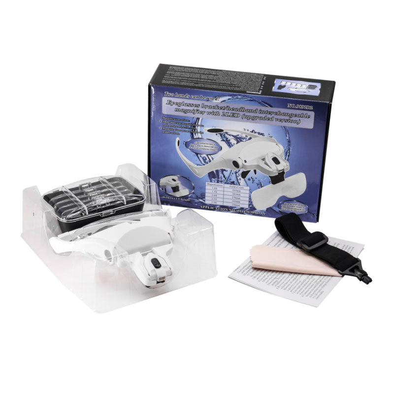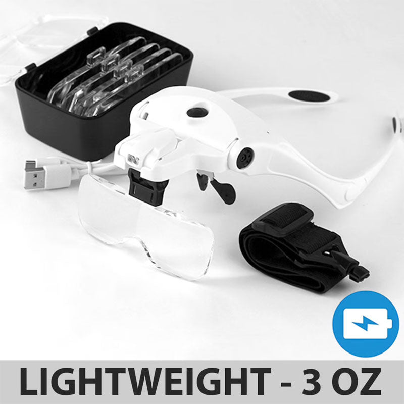 ILLUMINATE YOUR WORK HANDS-FREE: The LED Light is powered by a built-in lightweight rechargeable battery. The full charge lasts for about 4-6 hours. Recharges fully within 40 minutes with the USB cord included in the set.FITS OVER GLASSES:?It can be comfortably worn on top of your prescription eyeglasses (see pictures) for additional magnification. Place the nose pieces behind your eyeglasses. Use the headband for secure fit. See as never before!