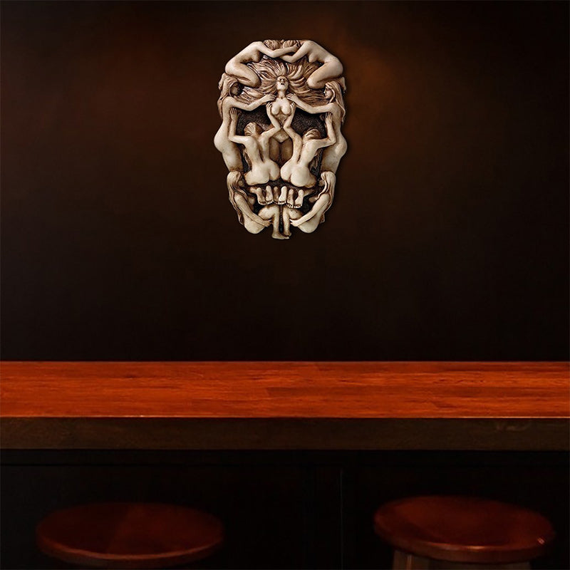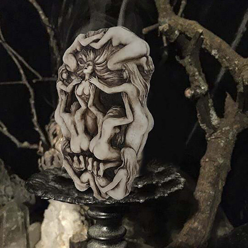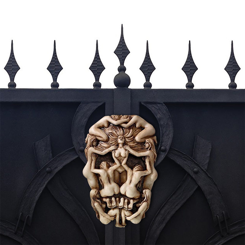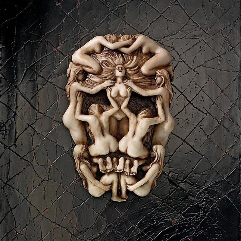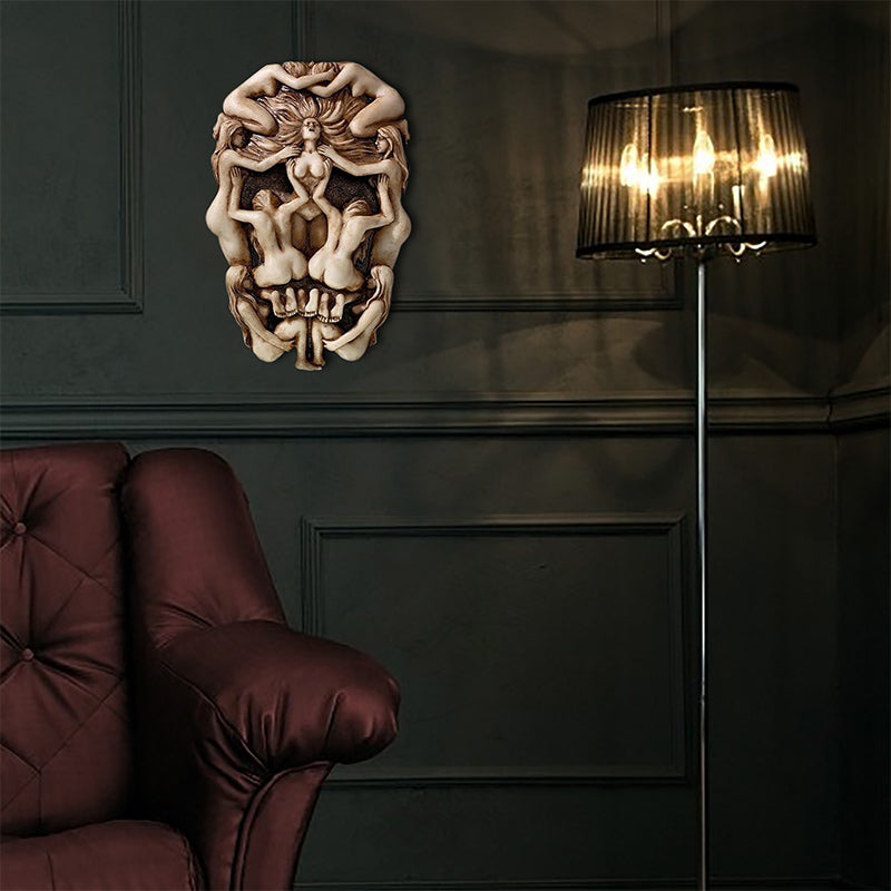 From a Latin phrase reminding all to remember, you too will die, this victorian style metaphoric optical illusion echoes life beckoning return to the grave. Cast in quality designer resin, the lithe human figures in this beautiful vanity form a starry-eyed skull as a visual pun on the fleeting flame of life. This artist's sobering and achingly beautiful, goth style work of art is hand-painted in an antique bone finish exclusively for Design Toscano.