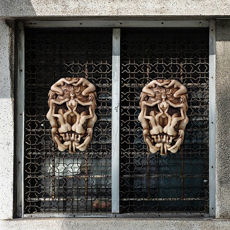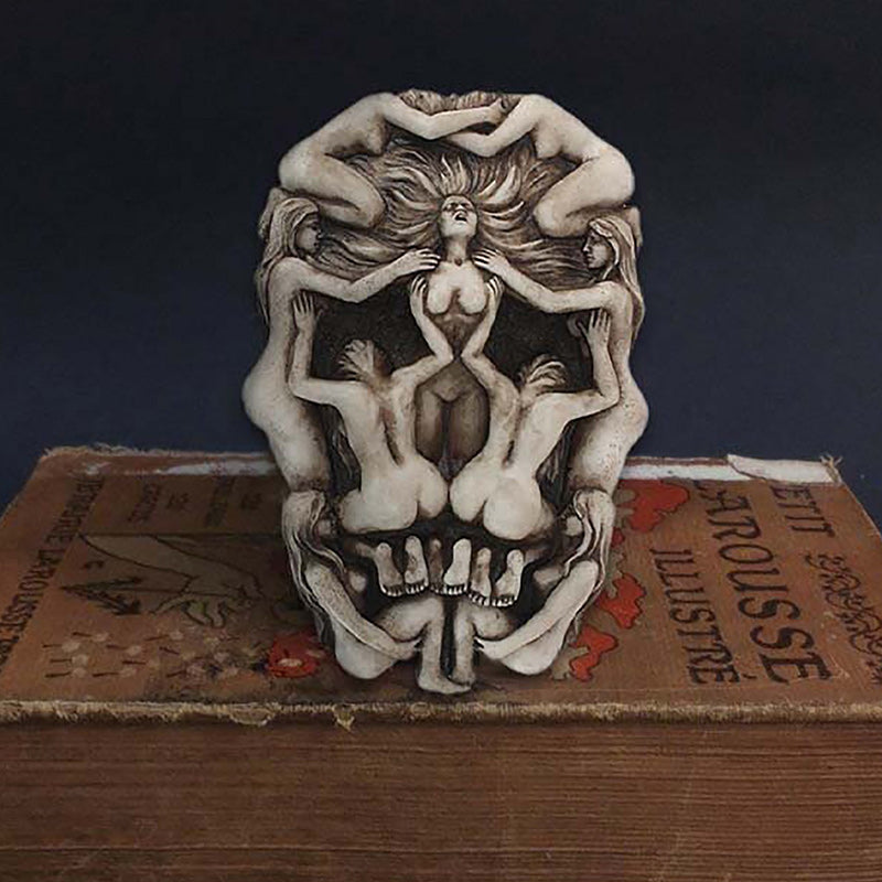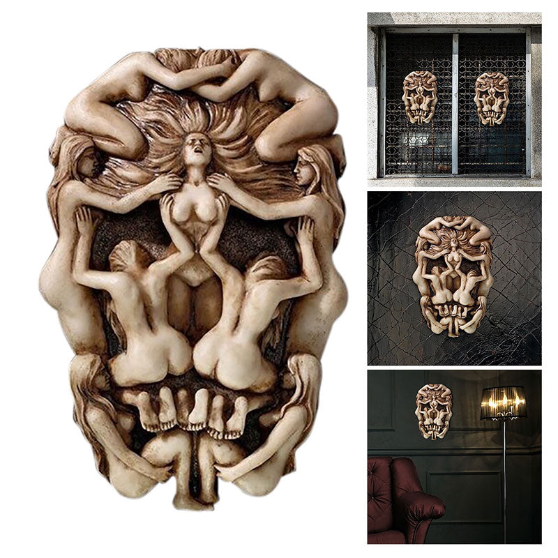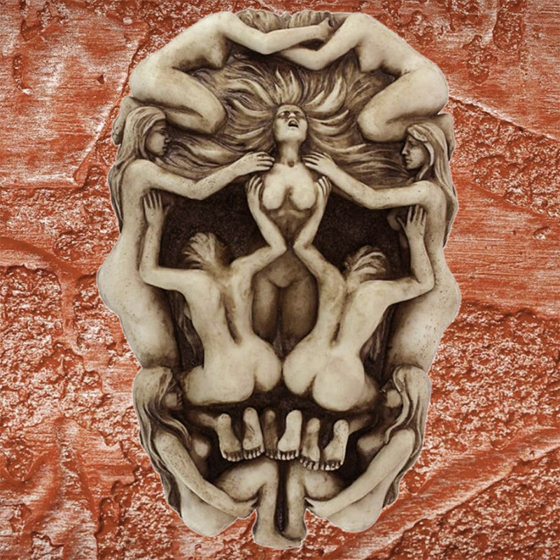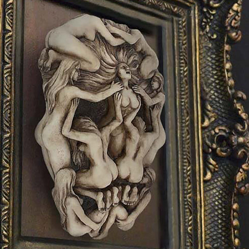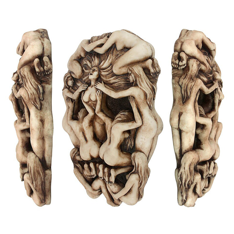 From a Latin phrase reminding all to remember, you too will die, this victorian style metaphoric optical illusion echoes life beckoning return to the grave. Cast in quality designer resin, the lithe human figures in this beautiful vanity form a starry-eyed skull as a visual pun on the fleeting flame of life. This artist's sobering and achingly beautiful, goth style work of art is hand-painted in an antique bone finish exclusively for Design Toscano.