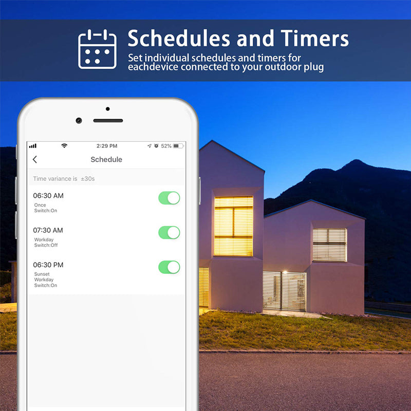 Schedule Use a schedule or countdown timer to set your smart plug to turn on and off automatically at the times you want. The sunset/sunrise difference makes it a better idea to act on the actual date.
