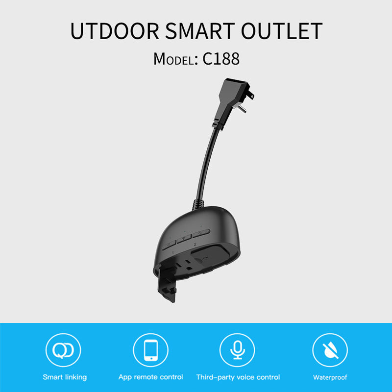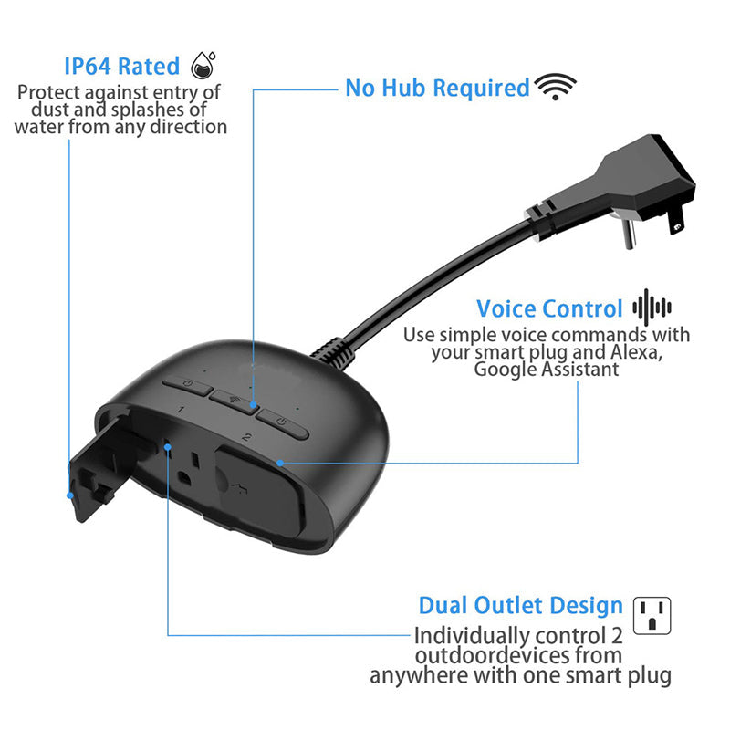 Individual Control of 2-in-1 Outlets 2 fully functional and individually controlled AC outlets. 15A/1875W max each. A waterproof cover is attached to protect the product from dirt when not in use. Wi-Fi range up to 300 feet with IP64 weather resistance.