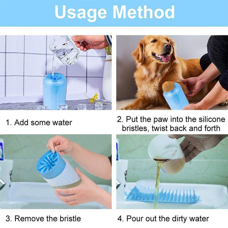 fill the foot cleaner with some water and put your pet's foot inside the cup. Gently rotate the cup and let the silicone bristles do the cleaning. Repeat 3 more times.