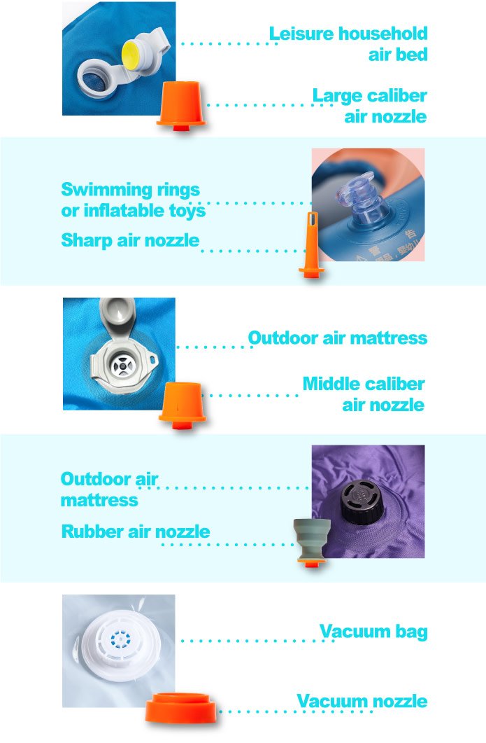 5 nozzles It comes with different nozzles to fit most air mattresses, inflatable pool floats, swimming rings, yoga ball and kid¡¯s toys. 1 nozzle for vacuum bag to save you more than 50% of space.