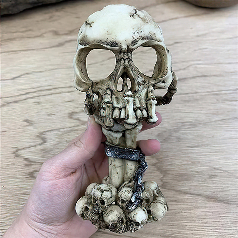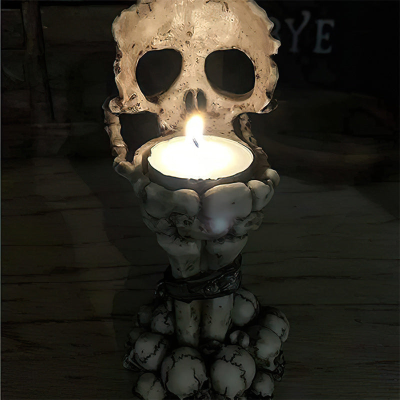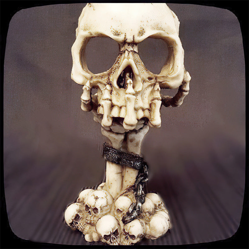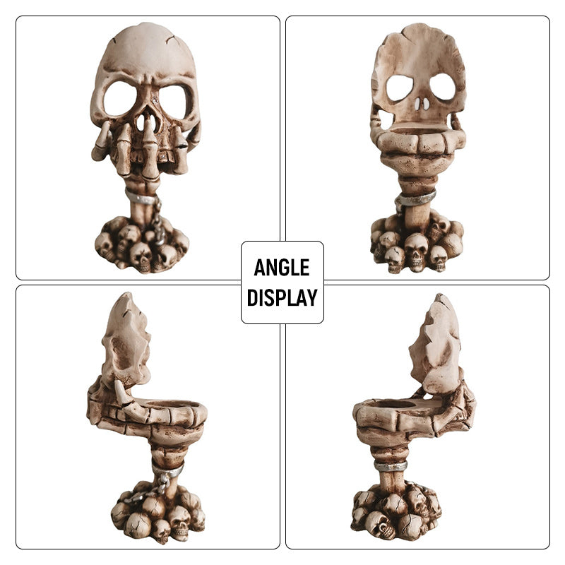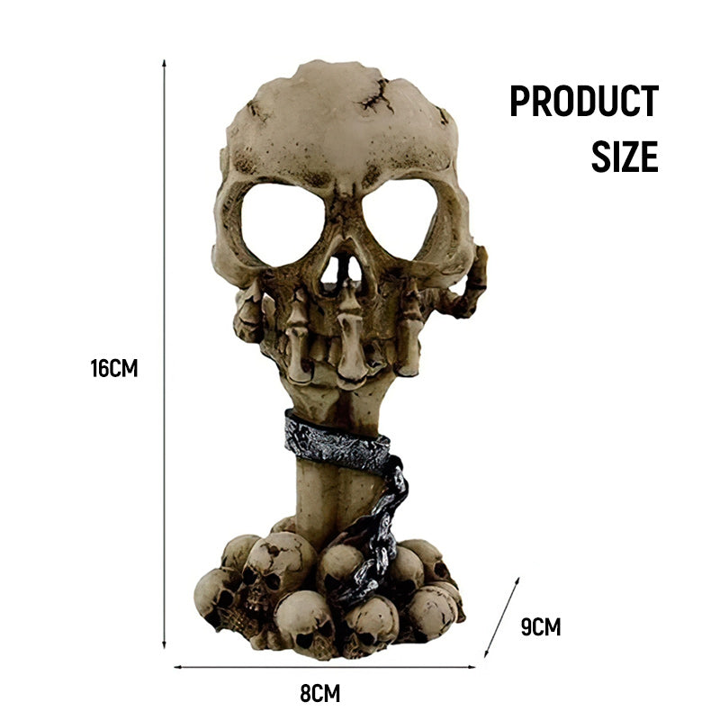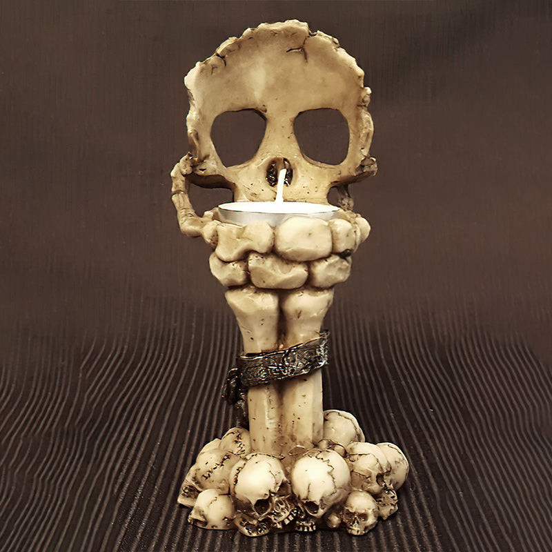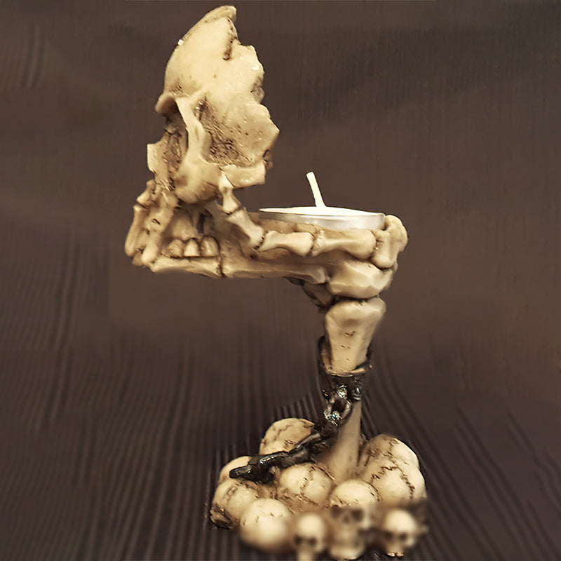 • 2. Rising in front of a pile of small skulls, a skeletal hand arises from below, yet Chained to the underworld. In his bony claws, he holds the frontal Piece of a human skull. When turned around, you can see his skeletal Palm which forms the resting place for a small tea light.