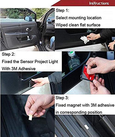 • Stick the Magnet on the bottom of the car frame. Stick the car light on the car door. The distance between the Magnet & Car light is about 10mm. When you close the car door, the Magnet is at the under face of the sensor on the car logo light.