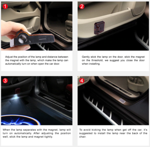 • When you open the door, the logo will be shown on the ground, and it will turn off automatically after 2 minutes. If you want the light on/off, just need to press the button on the head of the light.